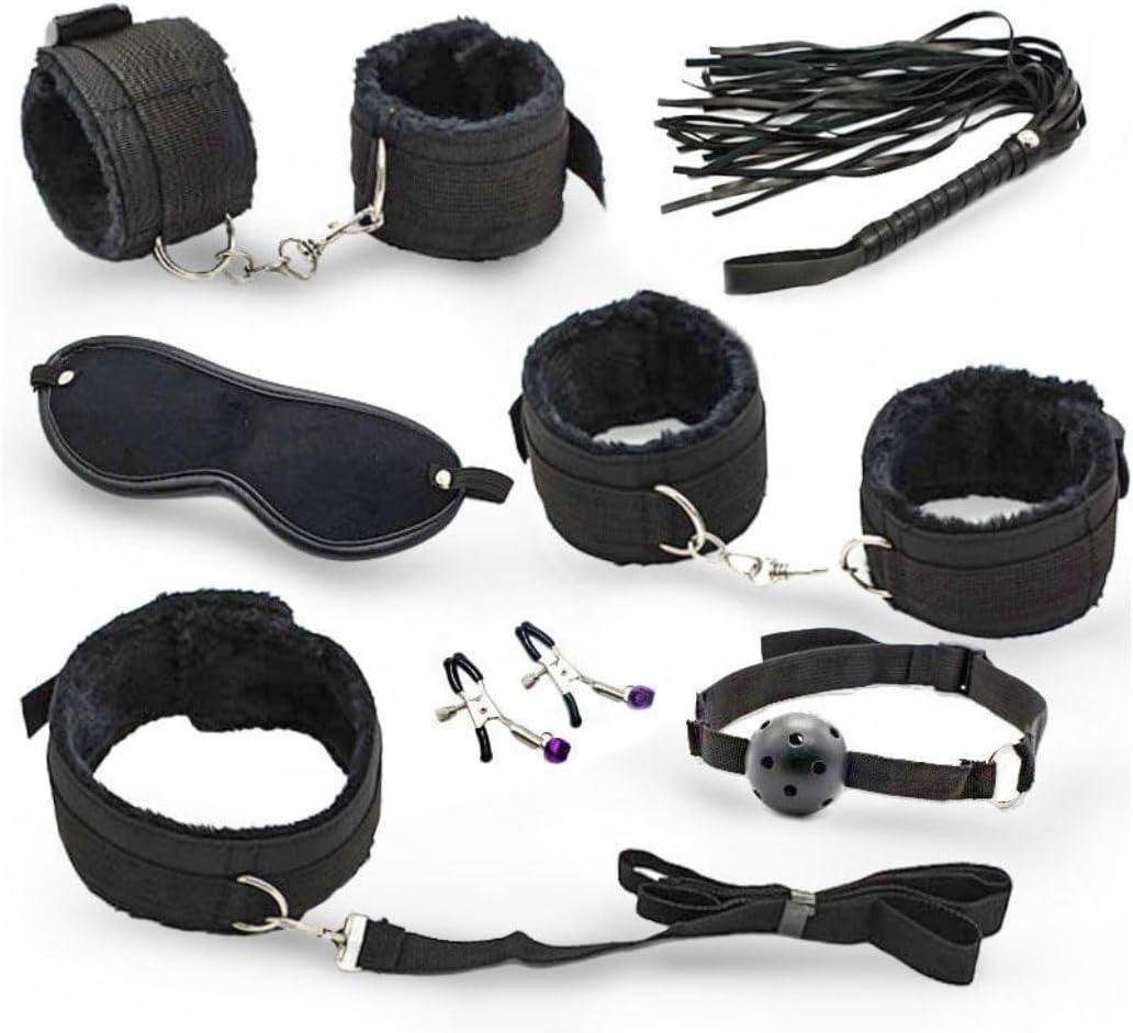 7X peças, venda olhos, algema pés/mãos, coleira, chicote, tapa boca, presilhas mamilos