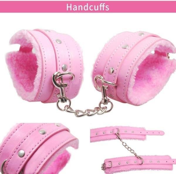 7 x peças kit, coleira, algemas pés/mãos, chicote, corda, mascara olhos, tapa boca